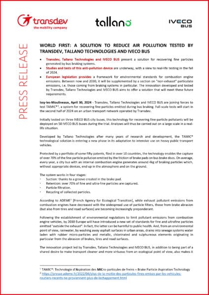Transdev, Tallano Technologies and IVECO BUS are joining forces to test TAMIC® , a system for recovering fine particles emitted during bus braking. Full-scale tests will start in the second half of 2024 on an urban transport network operated by Transdev.